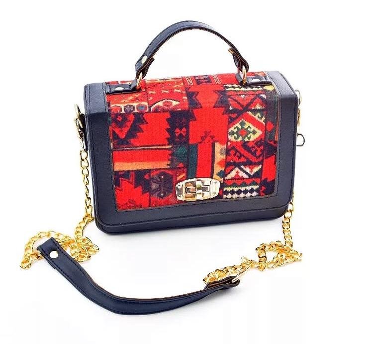 Add a touch of tradition to your modern style with this elegant crossbody handbag. Featuring a vibrant ethnic woven fabric in rich red and earthy tones, this bag combines timeless cultural artistry with contemporary design. The black faux leather frame and detailing provide durability and a sleek finish, while the gold-tone chain strap adds a hint of luxury.